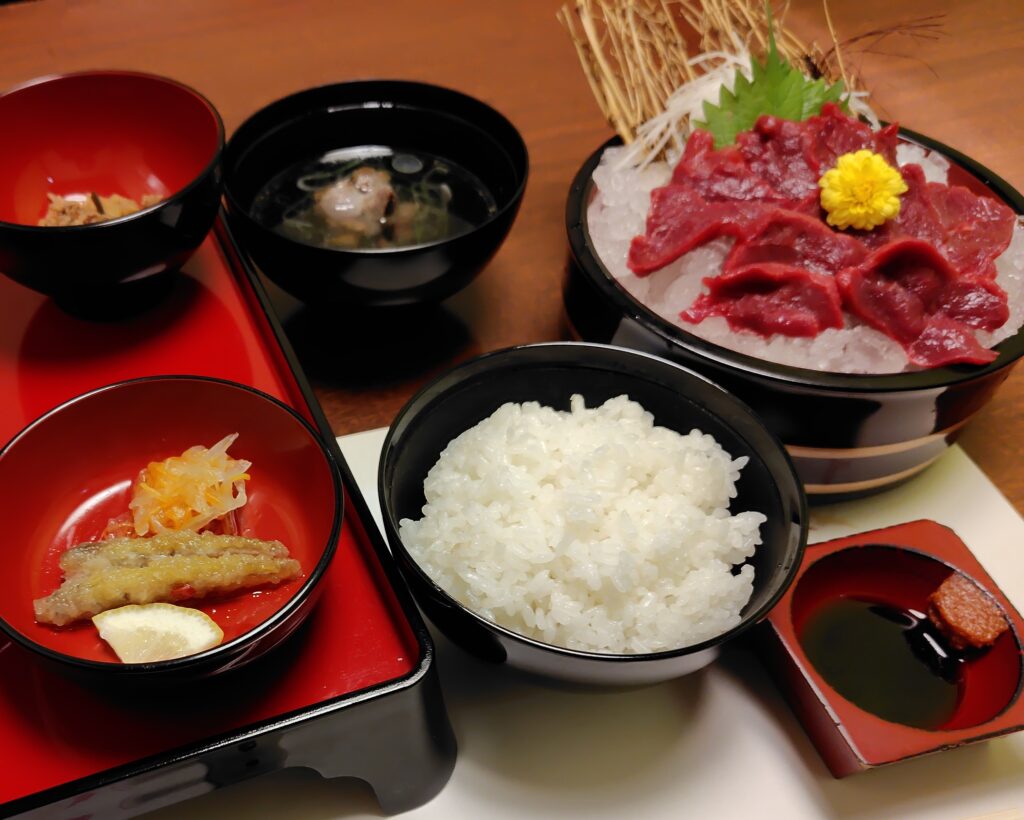 城下町では「馬刺し」も楽しめる。熊本と異なりご飯のお供となる馬刺し。マグロの様な味わいにねっとりとした食感。辛子味噌をつけると箸が止まらない。お米も少し硬めに炊いているのがGOOD!