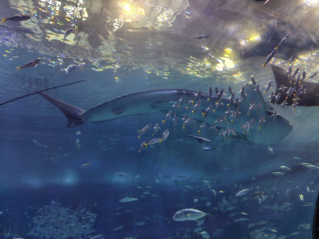 - 巨大水槽「黒潮の海」で泳ぐジンベエザメとマンタ