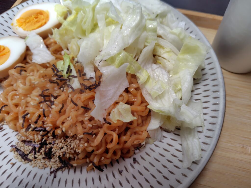 先手レタスとゆで卵を投入。
